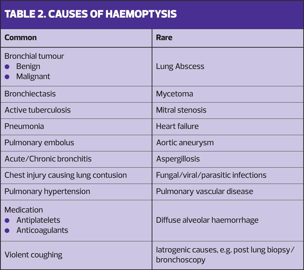 The degree of haemoptysis can vary from mild streaks of blood to massive haemorrhage, which needs emergency assessment. In Jack’s case, it was mild, streaks of blood in the sputum, only in the morning, so was not life threatening and could be safely investigated in primary care. For a full list of common and rare causes of haemoptysis see Table 2.