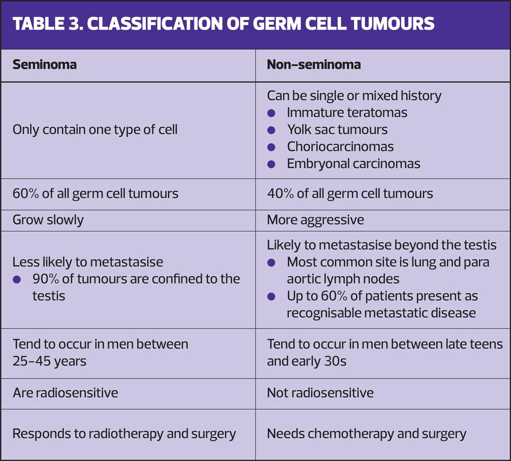 Most testicular cancers are germ cell tumours and they can be categorised into seminomas and non-seminomas (Table 3). Seminoma tumours are 100% seminoma. All other tumours, including those with a mixture of seminoma and non-seminoma components, are classified and should be managed as non-seminoma tumours. The correct classification is essential as the prognostic and treatment approaches are different.15 Jack’s tumour was classified as metastatic embryonal mixed tumour with a testicular primary. The lungs and surrounding lymph nodes are the most common sites for this type of metastasis.16,17