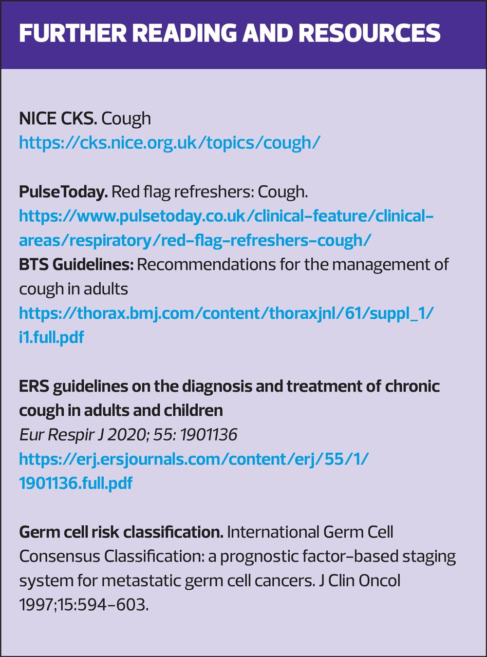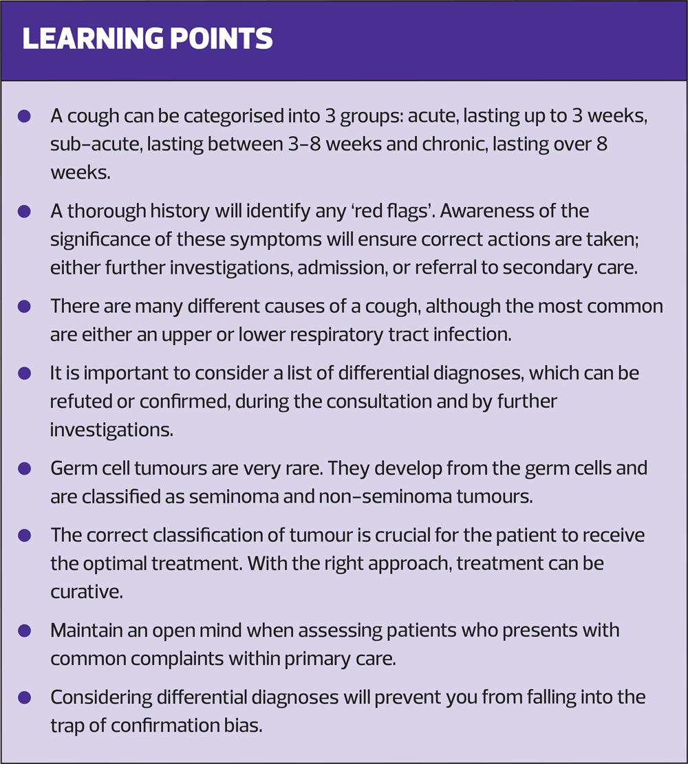 This article used a practice case study and, while it highlights many salient issues, I acknowledge that the list is not exhaustive. It is intended to provide an overview of cough, red flags and associated symptoms, and gives an introduction to germ cell tumours. Furthermore, it emphasises the importance of keeping an open mind and considering differential diagnoses when consulting with patients who present with common complaints in primary care.
