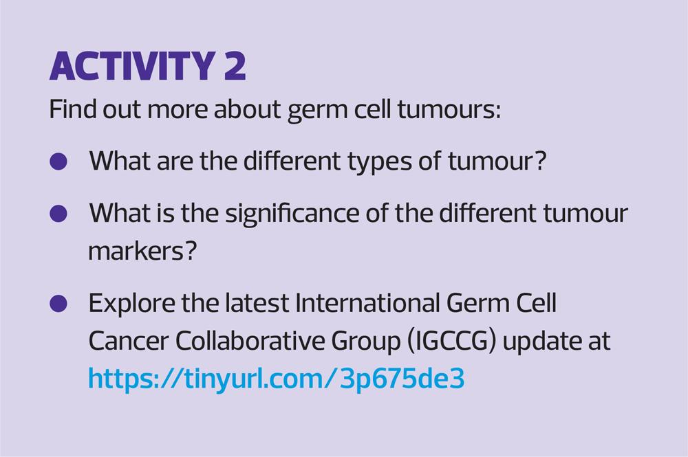 Tumour markers therefore enable differentiation between seminoma and non-seminoma tumours. This is important as seminoma tumours are radiosensitive and responsive to treatment with radiotherapy. Non-seminoma tumours are not.18 Tumour markers need to be measured as part of the initial investigation, prior to surgery and after surgery as the degree of elevation after surgery is an important predictor of prognosis.