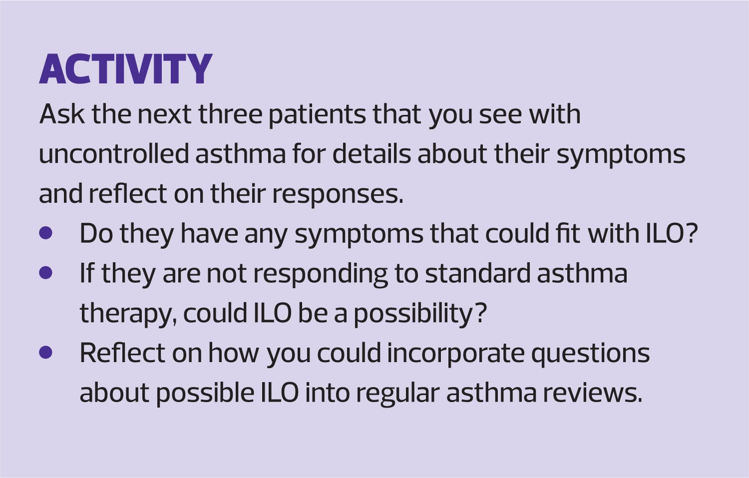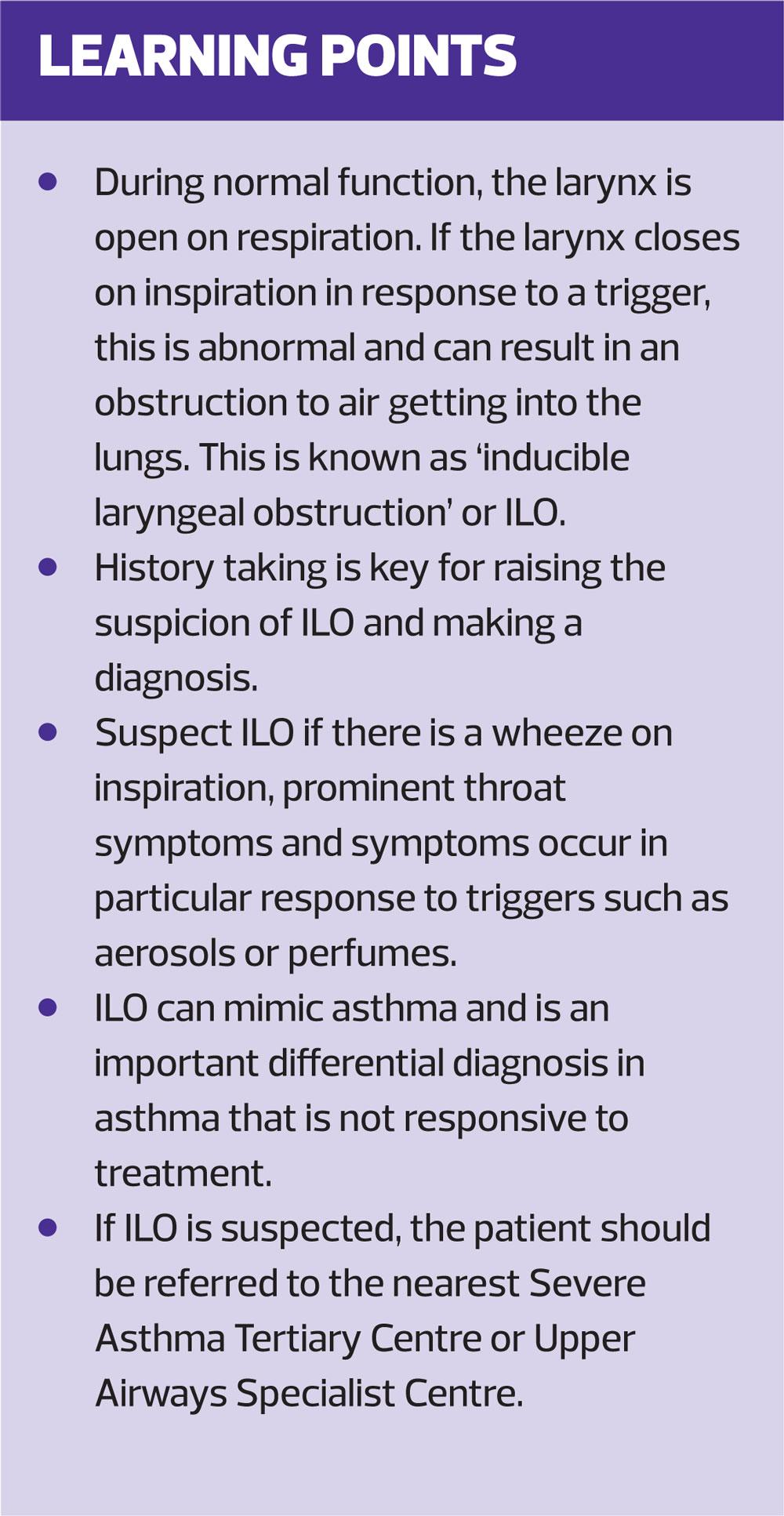 History-taking is key to raising the suspicion of ILO, but laryngoscopy, when a patient is symptomatic, is the clinical gold standard required for diagnosis. In patients describing frequent sudden ‘asthma attacks’ ask for a detailed description of the attack, or ask the patient to video record it on their phone.