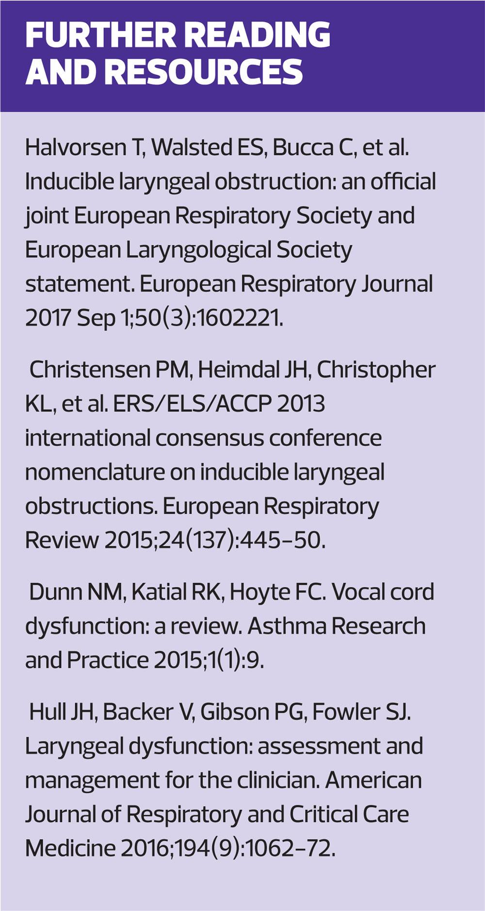2. Hull JH, Backer V, Gibson PG, Fowler SJ. Laryngeal dysfunction: assessment and management for the clinician. American Journal of Respiratory and Critical Care Medicine 2016;194(9):1062-72.
