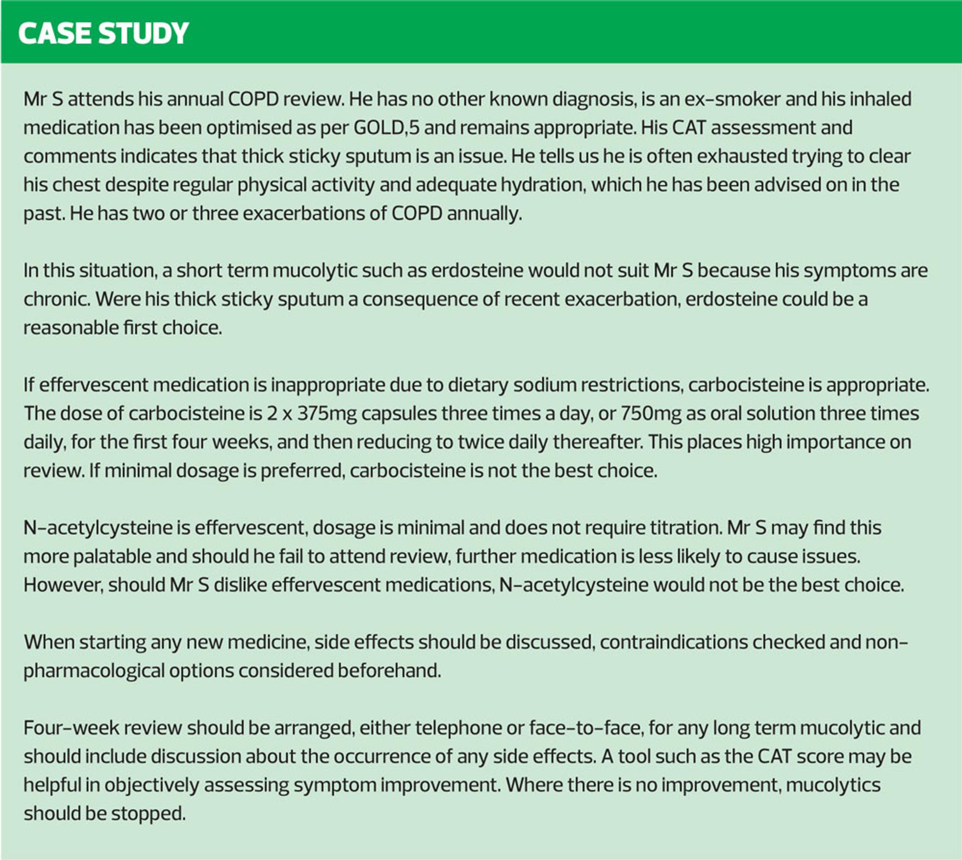 Identifying appropriate candidates for mucolytic therapy is essential to avoid unnecessary cost to the NHS, unnecessary risk to the person with COPD, and to ensure safe and optimal prescribing. It is recognised that mucolytics are not beneficial to all COPD patients, even among those experiencing chronic bronchitis-type symptoms, which is why mucolytics are not recommended as standard therapy for all patients with COPD. The importance of review if initiating a trial of long-term mucolytic therapy cannot be over-stated.8 This is particularly true where the pill burden and cost of medication that has not been titrated is significant, as is the case with carbocisteine. Stopping long-term mucolytics where no improvement is seen is important, and making an objective decision can be aided by symptom scoring tools such as CAT.