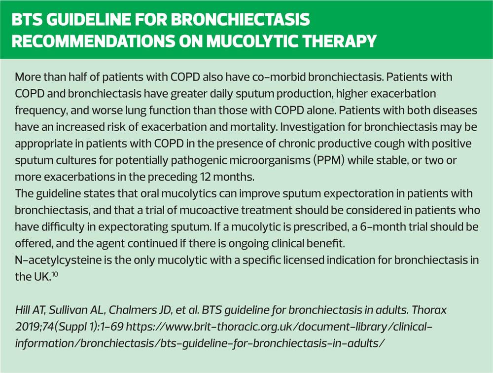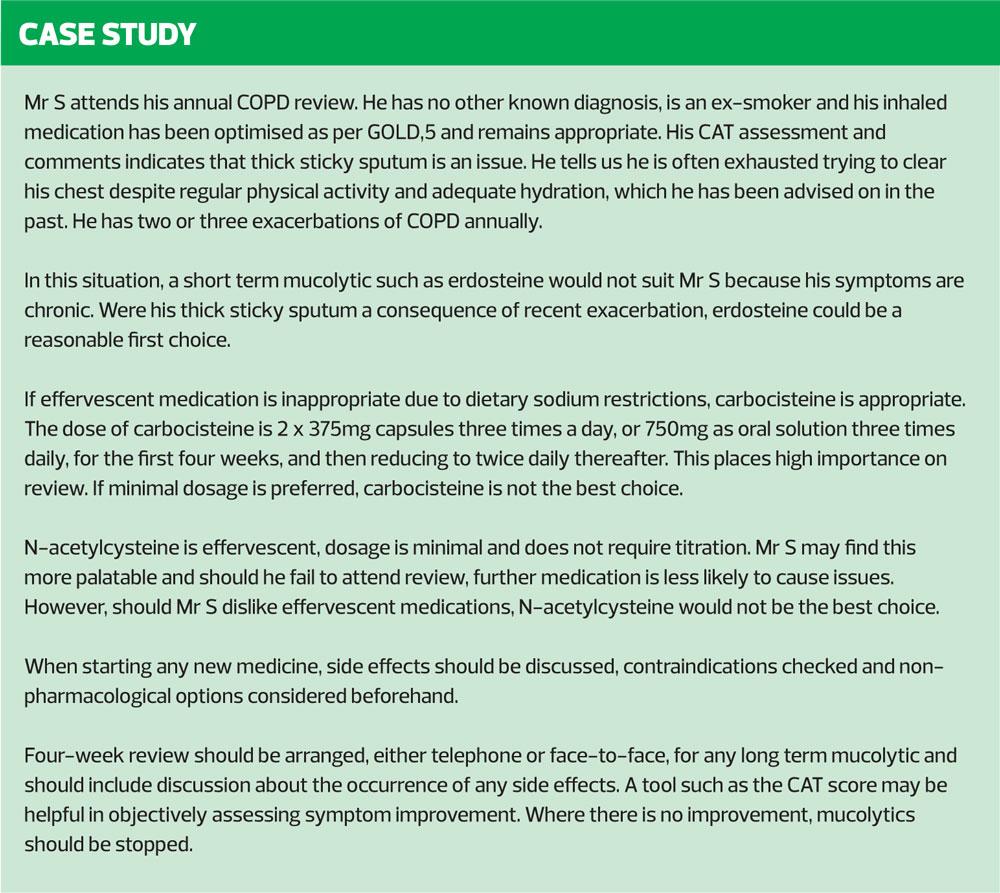 Mucus accumulation in the airways can pose several problems for people with COPD.1 Those effected with symptoms of chronic bronchitis and those not treated with inhaled corticosteroids are most likely to benefit from a mucolytic.5 Before considering pharmacological intervention, it is advisable to ensure that practical lifestyle advice and non-pharmacological intervention have been considered as these do not entail a cost burden to the NHS or pill burden to the person with COPD, do not carry the risk of side effects and do not add to the problem of polypharmacy.4
