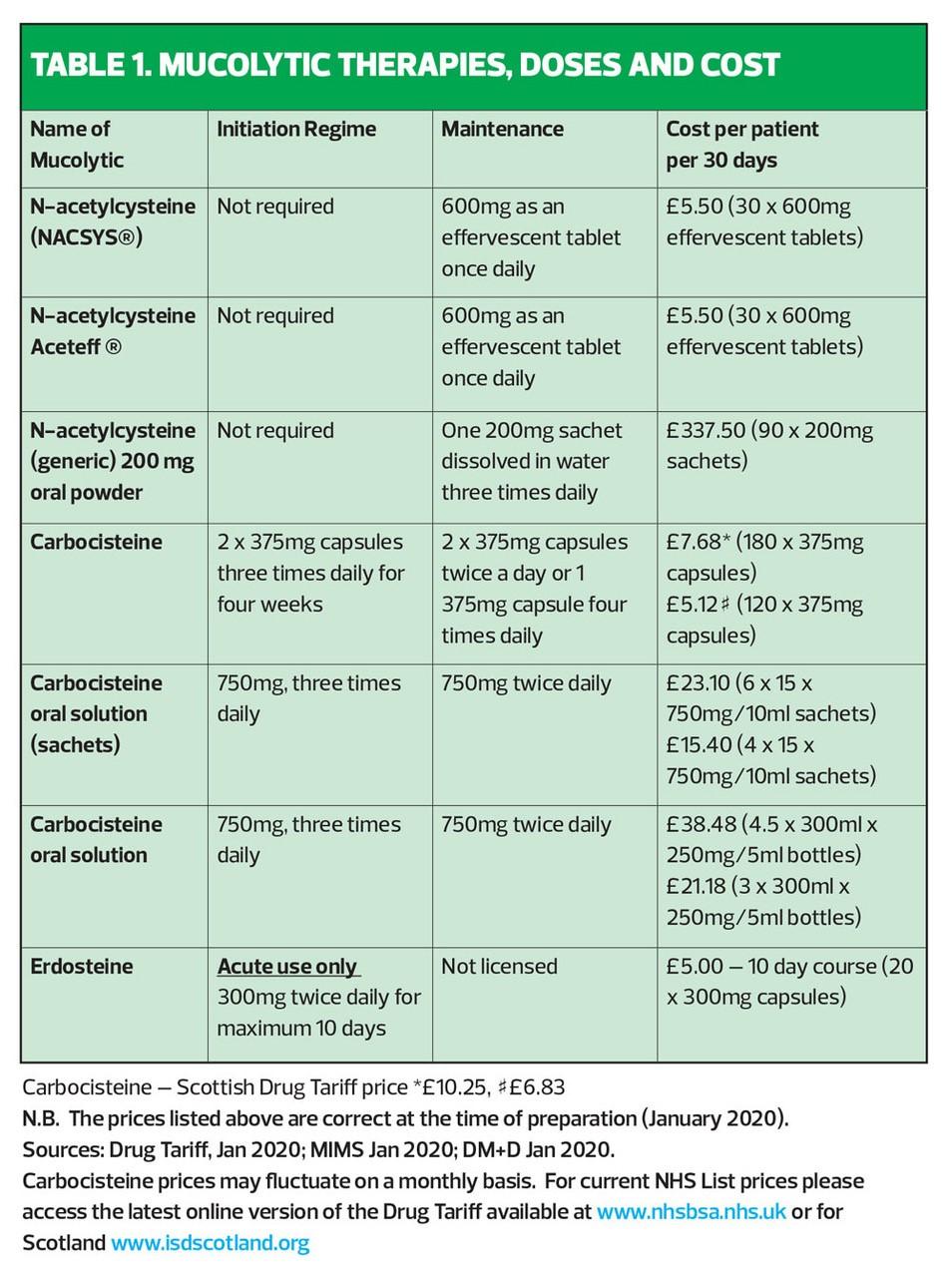 It is also of note that carbocisteine capsules contain both gelatin and lactose, which can be an issue for some patients, and they are quite large and can be difficult to swallow.9 There are liquid and dissolvable forms to overcome this problem, but these formulations are significantly more expensive than the standard capsules, a cost increase which prescribers should take into account (Table 1). Carbocisteine is available as a generic product and its price is regulated by the Drug Tariff.