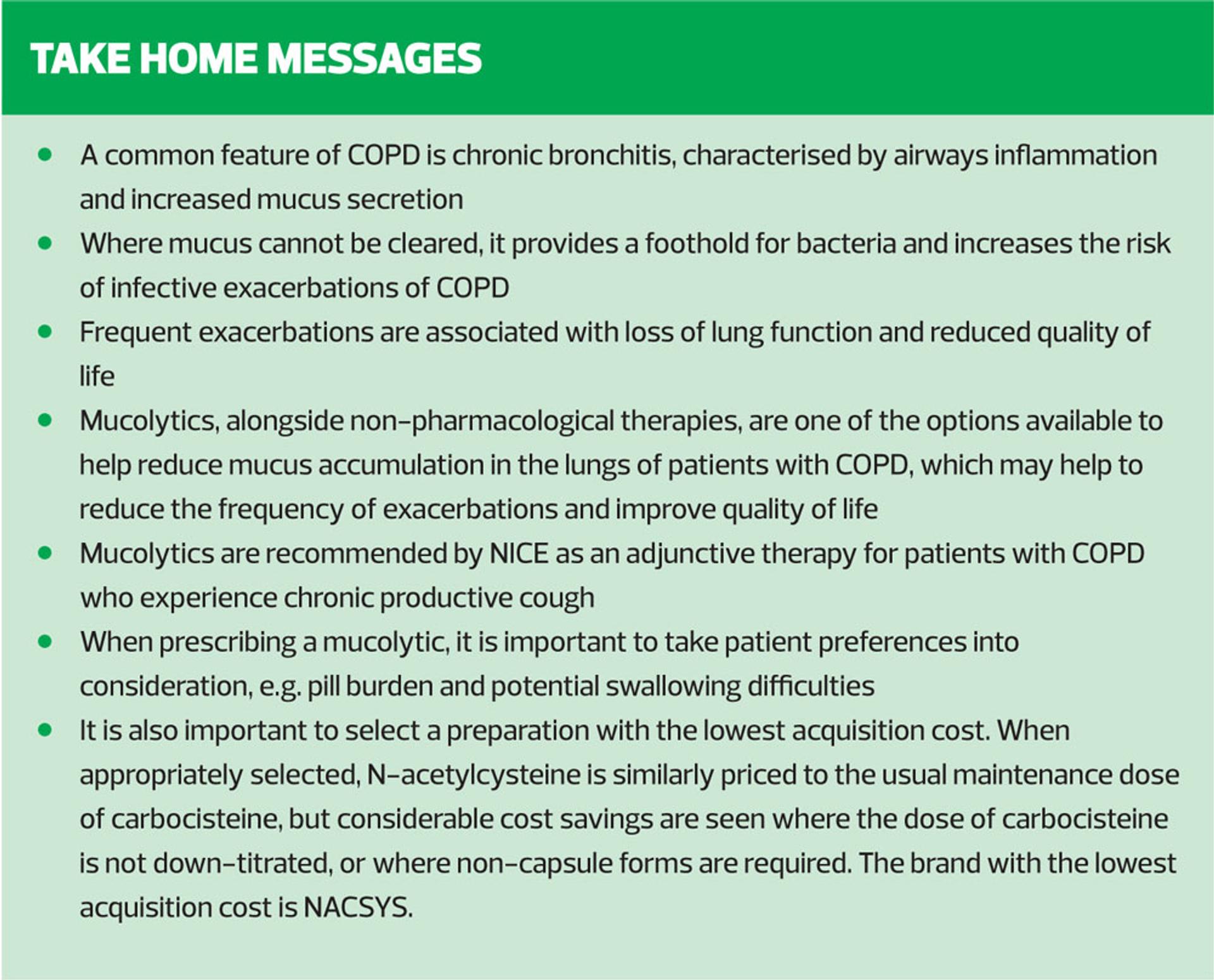 Until recently, N-acetylcysteine has not been licensed in the UK despite being widely used in Europe. It has the advantage of being a once-daily treatment, taken dissolved in water, which makes it acceptable to people who struggle with swallowing large capsules. When compared with carbocisteine, the pill burden is greatly reduced: the patient requires only 30 effervescent tablets per month (one per day) as opposed to a minimum of 120 capsules per month from the start and titration is not needed.10