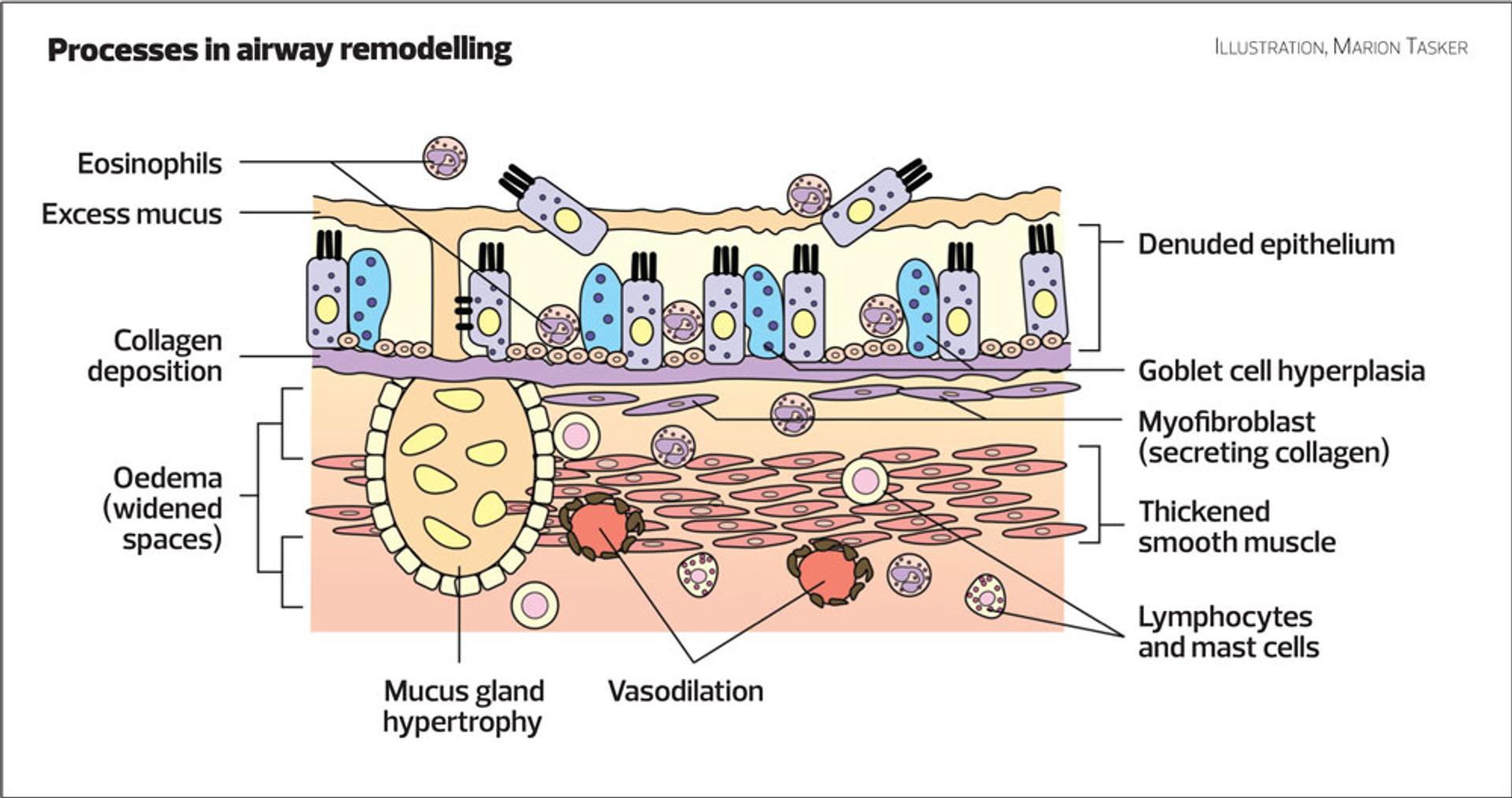 Another problem associated with chronic mucus accumulation and infection is remodelling of the airways. As the epithelium (thin surface layer) of the airways is damaged by invading microorganisms, the cells that are destroyed are replaced most frequently by more goblet cells, which are responsible for mucus production1 (Figure 1). This vicious and damaging cycle of cell destruction is then the cause of the increased frequency of infection. The result is that lung function deteriorates and the person with COPD becomes more symptomatic.