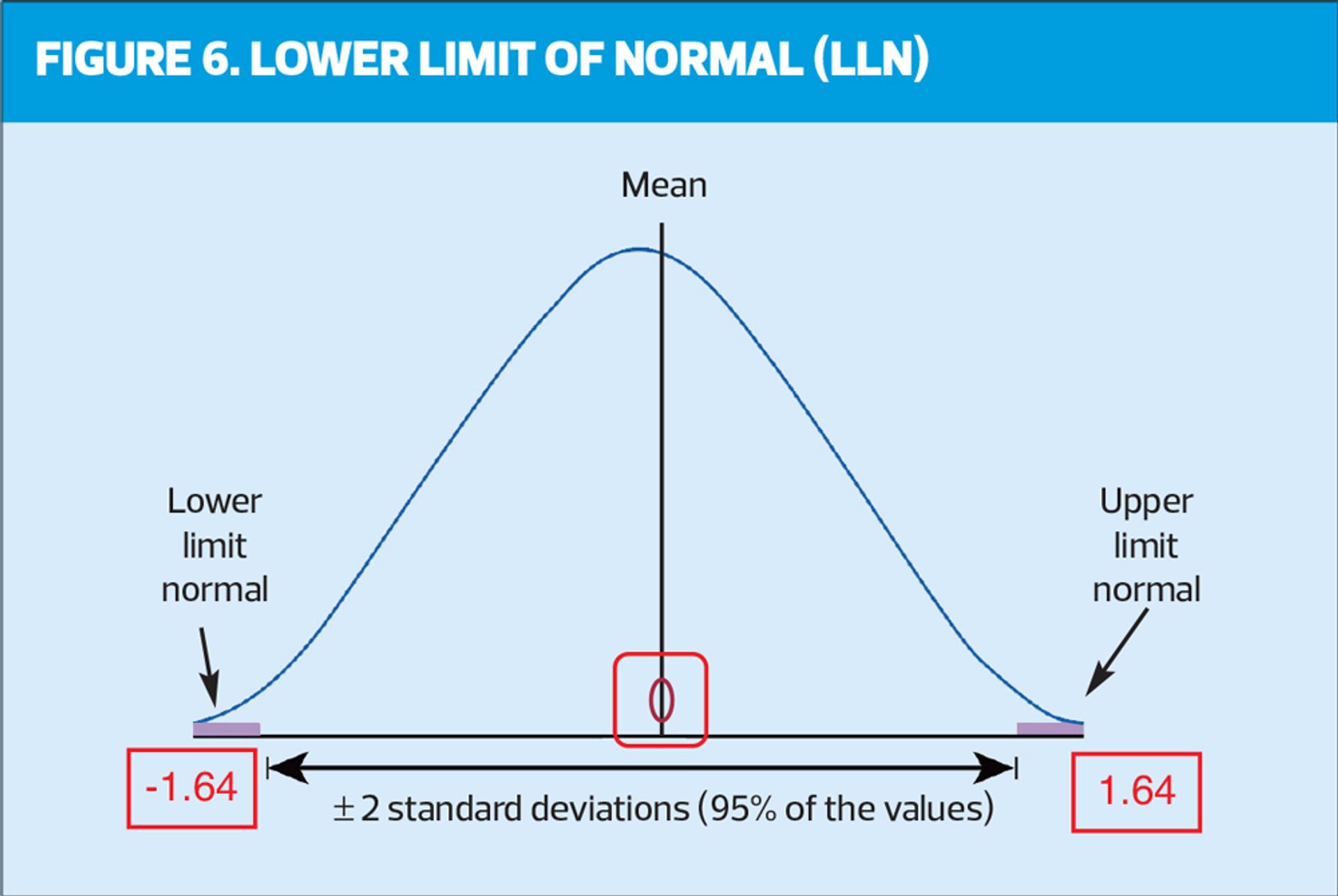 Historically, it has always been stated that a ratio below 70% (0.7) demonstrates the presence of obstruction but more recently there is evidence to suggest that using this fixed ratio is over diagnosing COPD in the elderly and underdiagnosing in the younger population.10 It is important therefore to use the LLN and/or Z scores. Z score is an indication of how far away from normal a test result is. A key point to remember is any result less than -1.64 is below the LLN and relevant. In this example it can be seen the FEV1/FVC ratio is 70% with a Z score of -1.63 (very close to LLN). The blue box shows a LLN ratio of 70%, which agrees with the Z score.