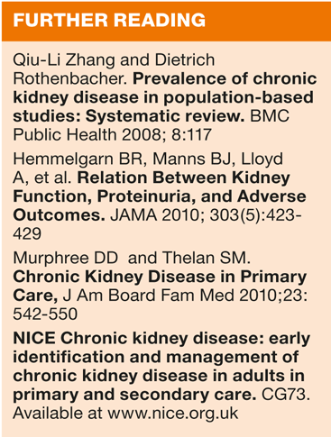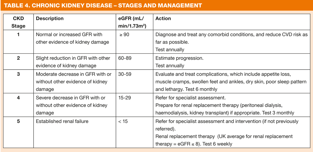 The estimated glomerular filtration rate (eGFR) is calculated (by the laboratory) from the serum creatinine level, taking into account the age, sex and race of the person. Glomerular filtration rate (GFR) provides an excellent measure of the filtering capacity of the kidneys, and therefore a low or decreasing GFR is a good index of chronic kidney disease. A decrease in GFR precedes kidney failure in all forms of progressive kidney disease.17 Total eGFR can therefore be used as an indicator of renal function. However, it is only an estimate and significant errors are possible in people at extremes of body type, for example malnourished patients.18 Ethnicity is also important when assessing results as the calculation used is not suitable for some particular groups. eGFR estimates should be increased by 20% in black patients.18 When eGFR is particularly low the patient may become lethargic, urine volume may be reduced and they may also develop symptoms of nausea and vomiting. Table 4 shows the stages of CKD in relation to eGFR values. Good practice indicates that identifying the presence and stage of CKD in an individual is not a substitute for accurate assessment of the cause of kidney disease, the extent of kidney damage and level of kidney function, management of complications of decreased kidney function or of comorbid conditions. Early recognition and treatment of risk factors for CKD including treatment of raised blood pressure, reduction of proteinuria, correction of anaemia and dyslipidaemia (to lower cardiovascular risk) may retard progression of CKD to end-stage renal disease, thus delaying the need for renal replacement therapy.19 Practice nurses play a vital role in hypertension and hyperlipidaemia management and are therefore already helping to slow progression in their patients with CKD.
