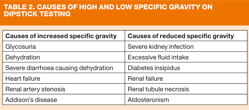 Urinary specific gravity measurement is a routine part of urinalysis, giving a measure of the concentration of solutes in the urine, therefore providing information on the kidney's ability to concentrate urine.10 There are a number of conditions which can cause specific gravity to be either elevated or reduced. These are shown in Table 2.