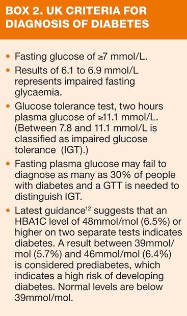 12. Diabetes UK (2012) Care recommendations: New diagnostic criteria for diabetes (Jan 2011). Use of Haemoglobin A1c (HbA1c) in the diagnosis of diabetes mellitus in the UK http://www.diabetes.org.uk/About_us/Our_Views/Care_recommendations/New_diagnostic_criteria_for_diabetes_/