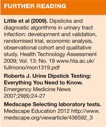3. Little P., Turner S., Rumsby K., Warner G., Moore M., Lowes J.A Smith H., HawkeC., Turner D., Leydon G.M., Arscott A and Mullee M (2009) Dipsticks and diagnostic algorithms in urinary tract infection: development and validation, randomised trial,economic analysis, observational cohort and qualitative study. Health Technology Assessment 2009; Vol. 13: No. 19 www.hta.ac.uk/fullmono/mon1319.pdf