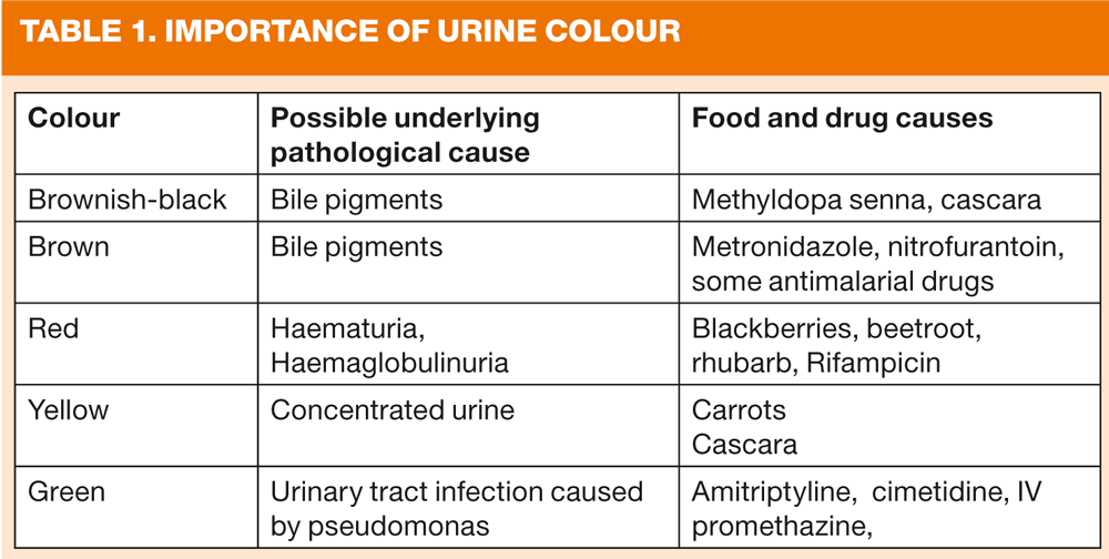 The normal colour of urine is pale yellow or amber but this may be darker or lighter depending on how concentrated or diluted the sample is. In addition to this the colour can be greatly affected by a number of factors including certain foods, medications and the presence of a urinary tract infection. Table 1 shows some of the causes of abnormal coloured urine.