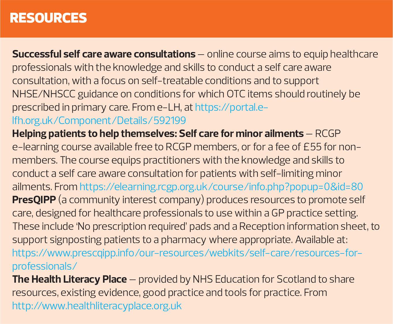 11. Health Education England. e-LfH. Successful Self Care Aware Consultations. https://portal.e-lfh.org.uk/Component/Details/592199