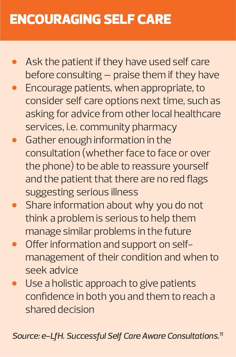 The self care aware practice nurse is a patient-centred, positive communicator and educator who is highly valued by patients.12 Supporting self care requires healthcare professionals and patients to engage in a two-way process and shared decision-making – it does not mean abrogating your responsibility or leaving the patient to simply ‘get on with it’. Converting just a small proportion of current consultations for self-limiting conditions to self care would deliver benefits to the practice and patients.11