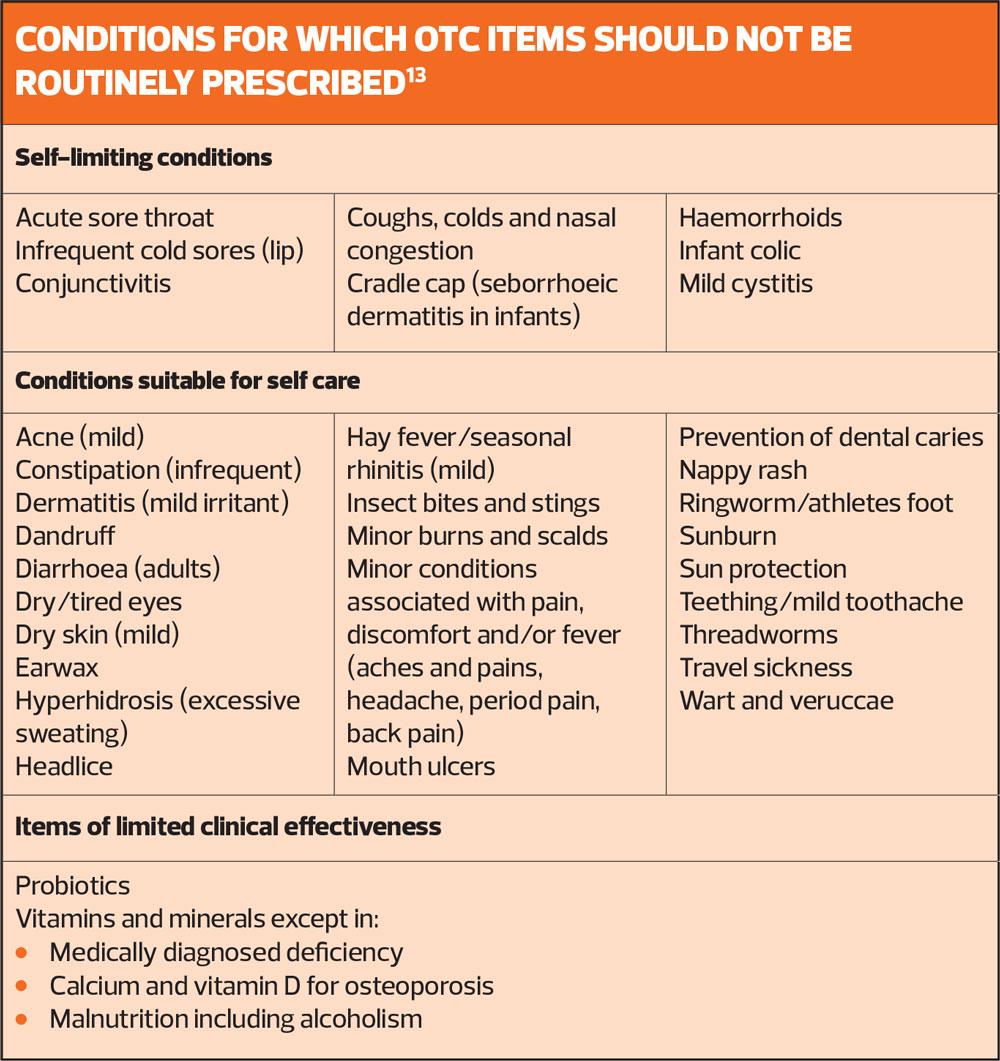 The NHS has therefore produced guidance on conditions for which OTC items should not be routinely prescribed in primary care. It is worth noting that many of the products that were included in the guidance cost the NHS up to four times more than they would cost to buy in a pharmacy or supermarket once dispensing fees are taken into account – and more than ten times as much if the cost of the GP consultation is included.3