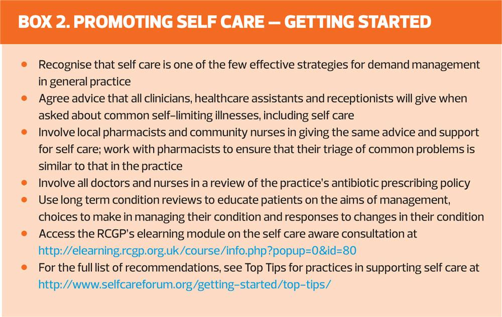 The Self Care Forum says promoting self care in general practice should be viewed as a long term project, but suggests that each practice takes on one or two steps to get started (see Box 2).5 The group says: ‘The “Holy Grail” is the self care aware consultation in which patients are asked if they have used self care before consulting and are praised for doing so; are encouraged, when appropriate, to consider self care options next time; are offered information and support on self-management of their condition and when to seek advice, and this is taken. The self care-aware doctor or nurse is a patient-centred, positive communicator and educator who is highly valued by patients.'