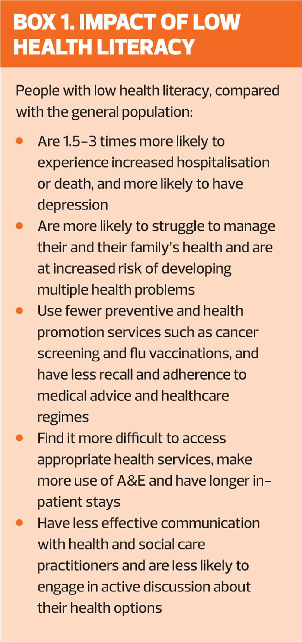 Low health literacy has a direct impact on the NHS and contributes to the strain the health service is currently under. Misunderstanding health advice and information increases the likelihood that people will misuse NHS services and be less able to participate in self care (Box 1).