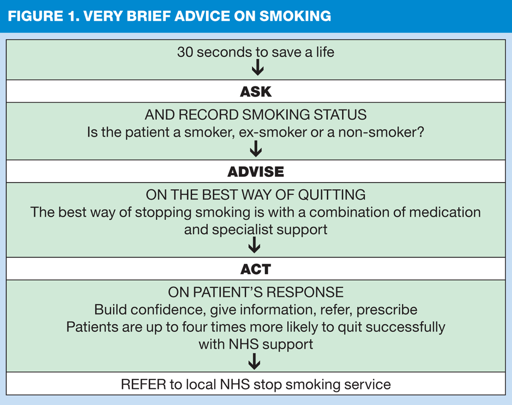 Simple advice from a healthcare professional can have a small but significant effect on smoking cessation — more so than nicotine replacement therapy alone.1 Advice or counselling given by nurses significantly increases the likelihood of successfully quitting. However, it is unlikely to be possible to spend 10 minutes in a single consultation discussing smoking when this may not have been the primary focus of the consultation, so offer 'Very Brief Advice' to smokers at every opportunity.1