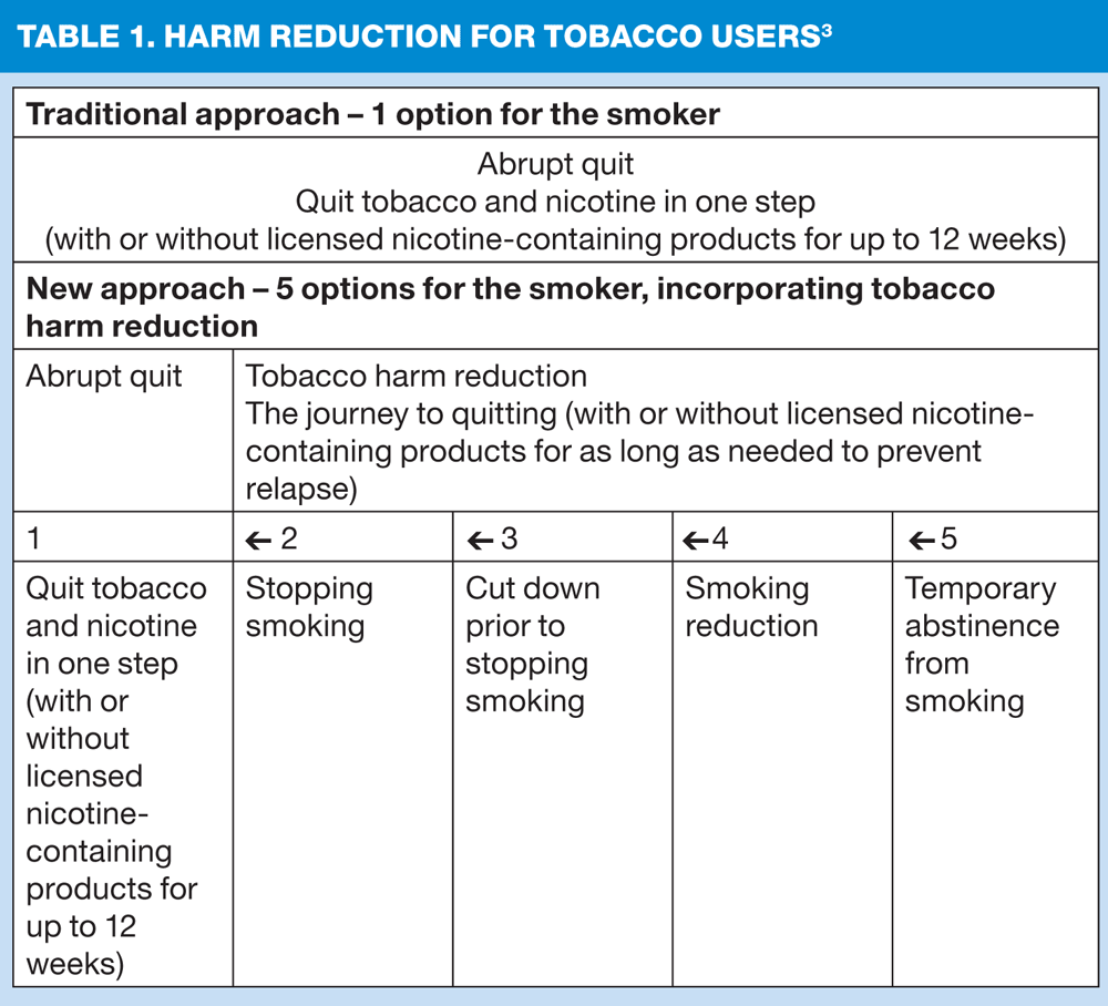 The aim of the guidance is to primarily help people who may not be able (or want) to stop abruptly, may want to stop smoking without necessarily giving up nicotine, or may not be ready to stop completely but may want to reduce the amount they smoke. While quitting smoking remains the primary objective, this alternative method will allow smokers to reduce harm to themselves and others using a different approach. (Table 1)