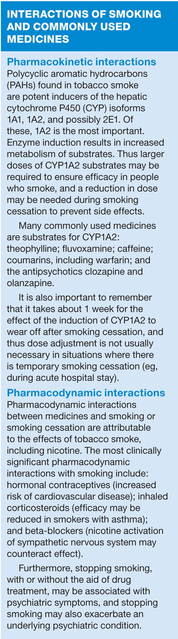Smoking induces the liver enzymes responsible for metabolising some medicines that have a narrow therapeutic index. The Department of Health's guidance recommends that stop smoking advisors establish whether clients are taking any medicines that may be affected when they stop smoking. You can find up-to-date information about clinically significant drug interactions with smoking and smoking cessation products in the October 2009 edition of the Medicines and Healthcare products Regulatory Agency (MHRA) publication, Drug Safety Update.6 (Box 1)