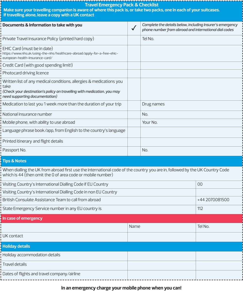 To help travellers, the author designed this list of all the information that would have been useful to have at hand. Having this completed checklist both as hard copy and stored on a mobile would have significantly reduced stress and anxiety in the event of any accident or medical emergency abroad.