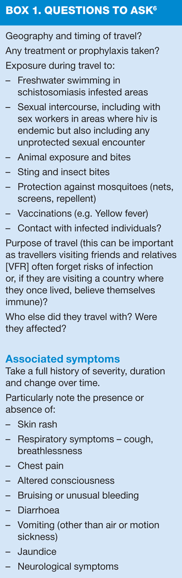 We need to keep our heads, be systematic and exclude the important things including malaria. Seeking advice when unsure, careful safety-netting and reading up on diseases with which you may be unfamiliar will help the practice nurse negotiate this interesting area safely and well.