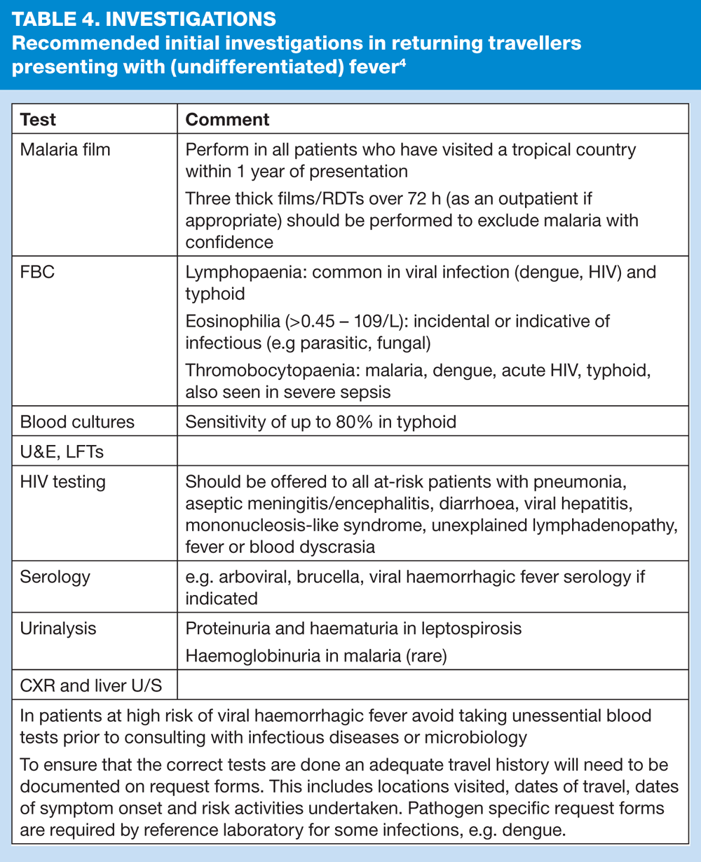 Tables 2 and 3 mention some of the conditions that we may see in returning travellers, and the areas where these infections are found. Table 4 sets out the commonly used investigations. More specific detail regarding a few important infections is given below together with recommendations for further study.