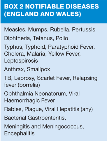 Finally remember the statutory need to notify — the list of notifiable diseases (box 2) includes bacterial dysentery, cholera, malaria and dengue.