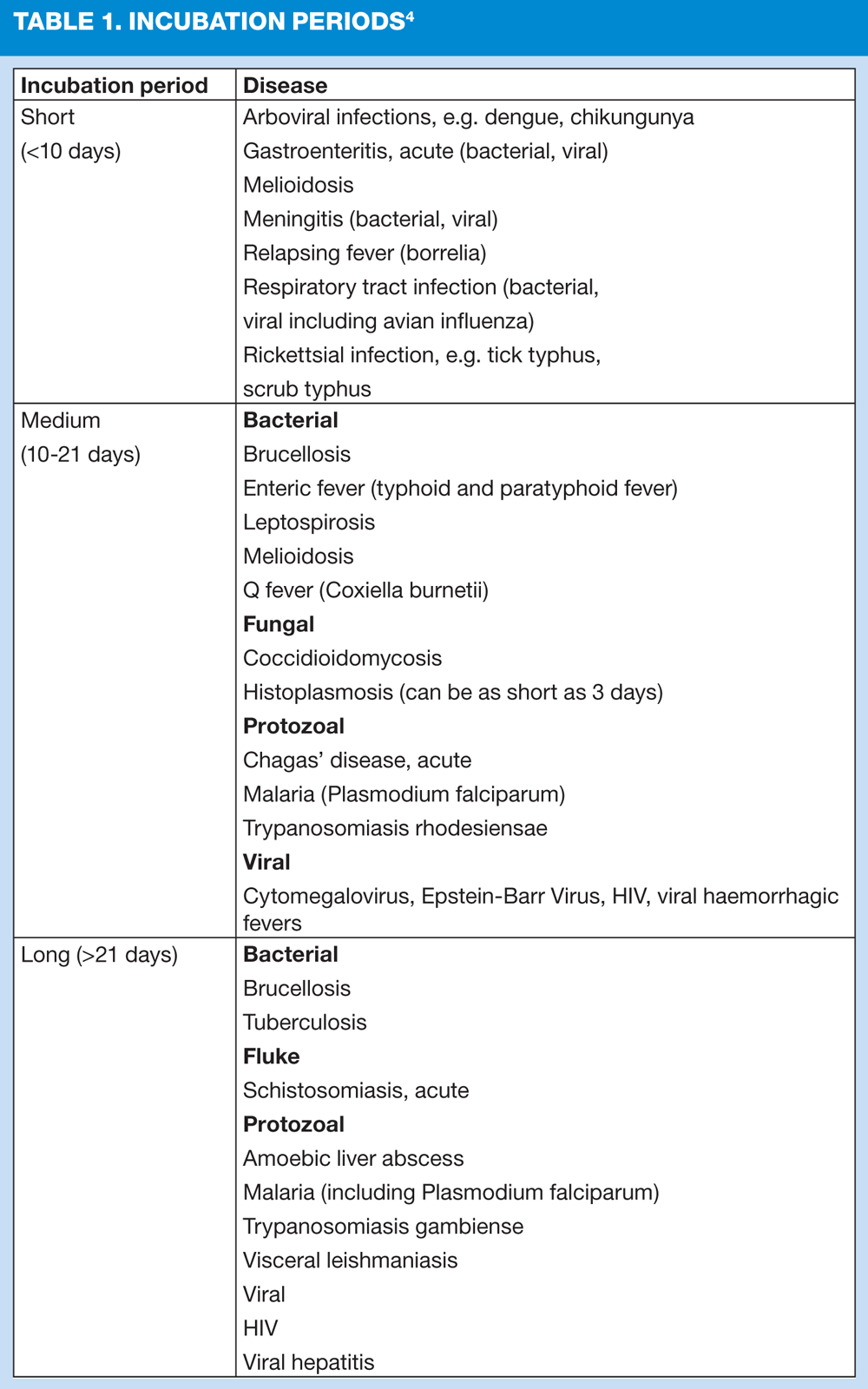 Table 1 gives a list of some symptoms and incubation periods of infections relevant to returning travellers.4 This may allow you to exclude some infections from the differential diagnosis.