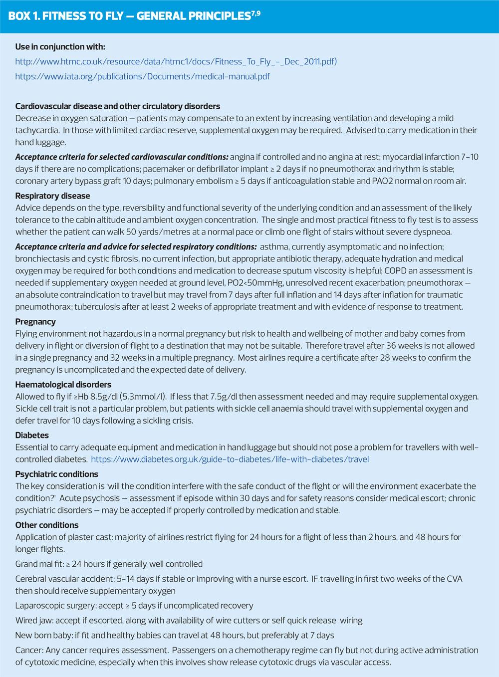 Greater detail on the specifics of fitness to fly are contained in Guidance for Healthcare Professionals on the CAA website at https://www.caa.co.uk/Passengers/Before-you-fly/Am-I-fit-to-fly/Guidance-for-health-professionals/Assessing-fitness-to-fly/. Within this section information is included for cardiovascular disease, diabetes, haematological disorders, pregnancy, psychiatric conditions, respiratory disease and surgical conditions. It is the physiological impact of airline travel that can effect some of these conditions and an understanding of their influence is important. The International Air Transport Association (IATA) is the trade association for the world’s airlines, representing some 290 airlines or 82% of total air traffic. It supports many areas of aviation activity and help formulate industry policy on critical aviation issues. IATA has a medical manual which details greater specifics on individual medical conditions, the assessments required and outlines acceptability of the individual traveller’s fitness to fly. Box 1 outlines some of the general principles that may impact a traveller, based on the information within these two documents, but the documents themselves should be accessed for complete information.8,10