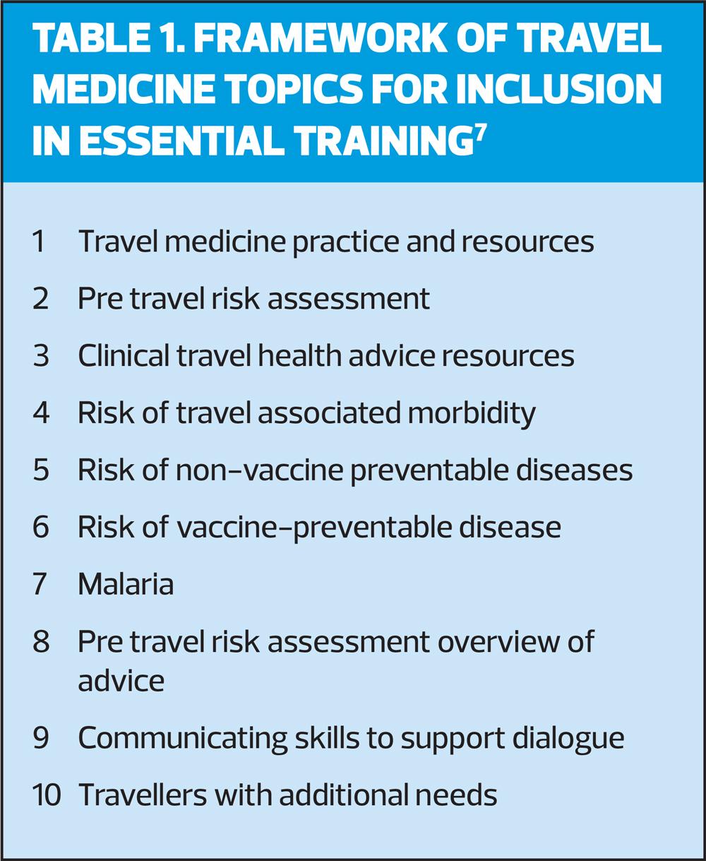 If you are new to travel health, it is very important that you undertake an introductory course in the subject. There are a number of courses available delivered as in-person, online or e-learning formats. There are advantages and disadvantages to each method, very much dependent on the type of learner the student is. Therefore, it is important to look around before committing to training, looking at who the trainer is, their qualifications and experience, if the course content follows the aforementioned GPG document,7 and availability of the training.