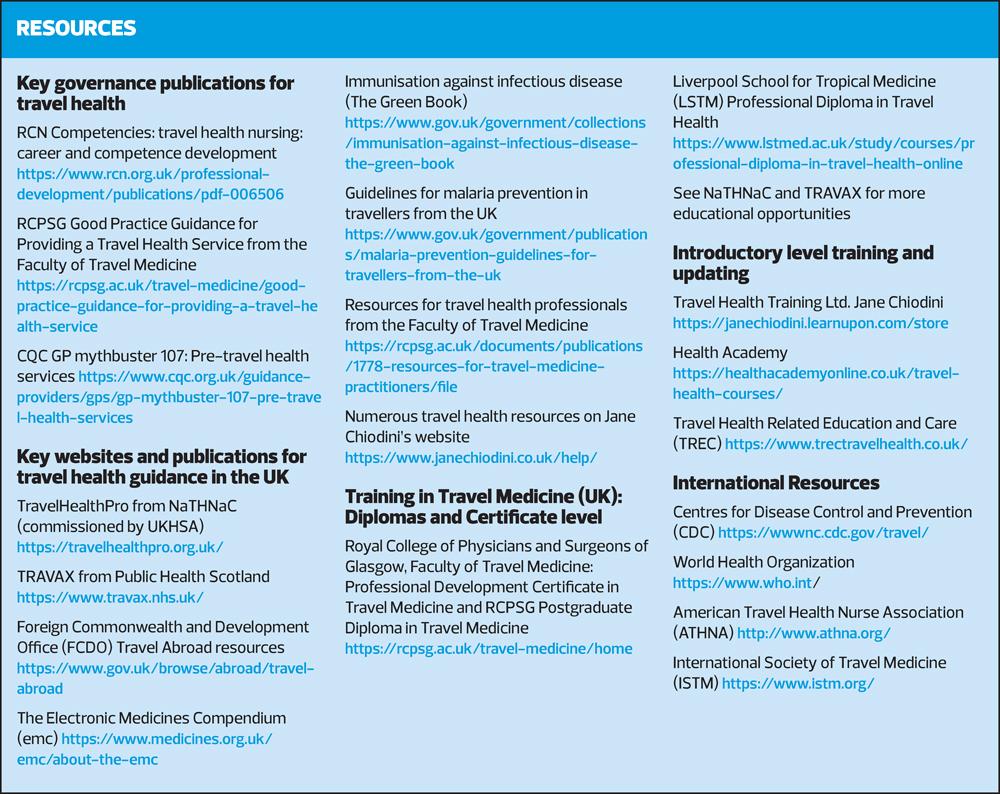 Although bespoke training would be optimal, there are other ways of ensuring the latest changes and news are followed. These could include signing up to the news updates sent out regularly from NaTHNaC and TRAVAX (subscription currently required if working in England, Wales and Northern Ireland). Experts can also be followed on social media platforms, such as Facebook and Twitter. There are frequent questions posted on GPN Facebook forums which raise awareness of common queries, but if you follow and/or contribute to these, then great care must be taken to evidence responses. In general, specific clinical enquiries would be ill advised and could be in breach of the NMC Code.17 For those who truly enjoy travel medicine, further training would always be recommended to extend experience and knowledge. Courses are available at Certificate and postgraduate Diploma level. There are also international groups that offer education and support, along with large conferences as well. (See Resources)