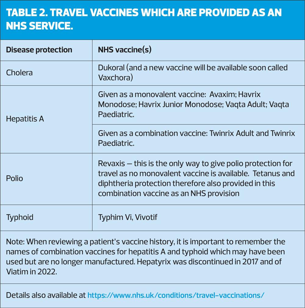 Travel health has been provided in primary care since the 1966 GP contract. Such care was deemed of public health importance for diseases such as polio, cholera, hepatitis A and typhoid as these faecal-oral infections are easily spread in a local population. So it was decided to administer immunisations to protect against such diseases in relation to travel abroad as an NHS funded provision as described in Table 2. In more recent times, travel was part of additional immunisation services and a GP surgery was allowed to opt out if they officially declared it, then an alternative provider would be identified. However, since 2020, travel health has been part of the ‘core’ GP contract and so currently, it must be provided in general practice.10 There has been much discussion about this with many surgeries deciding they will still not provide a service. However, the CQC mythbuster states this is a requirement and identified the scope of this care as follows: