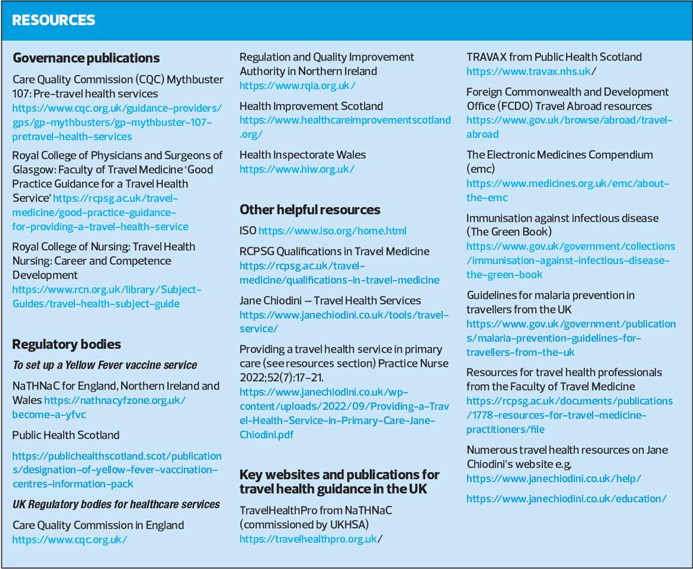 6. Care Quality Commission. GP mythbuster 107: Pre-travel health services; 2022 https://www.cqc.org.uk/guidance-providers/gps/gp-mythbusters/gp-mythbuster-107-pretravel-health-service