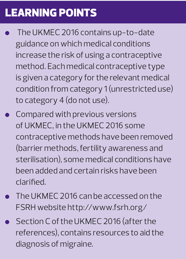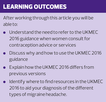 The UKMEC 2016 guidance provides up-to-date recommendations on the suitability of different contraceptive types for women with different medical conditions. The additional resources in the document to aid the correct diagnosis of migraine headaches, with or without aura, make the guidance an indispensable resource for all clinicians dealing with contraception. All clinicians should ensure they have easy access to this document during their clinics so that they can refer to it when needed.