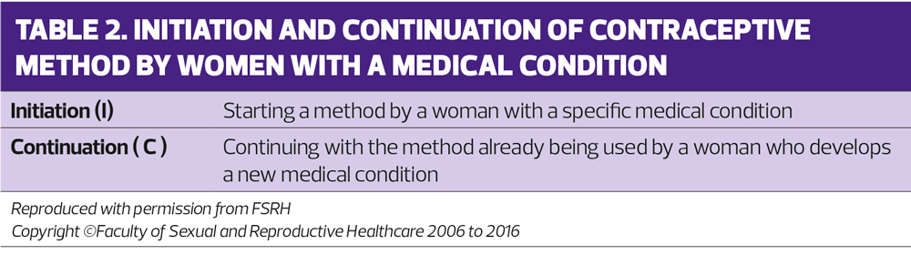 Sometimes the category an individual method is given will depend on whether the woman had the condition before that method was started (initiation) or whether the woman developed the condition whilst on the contraceptive method (continuation) – see table 2.1 The concern with continuation of the method is whether, theoretically, the method could have contributed to the development of the condition in question.
