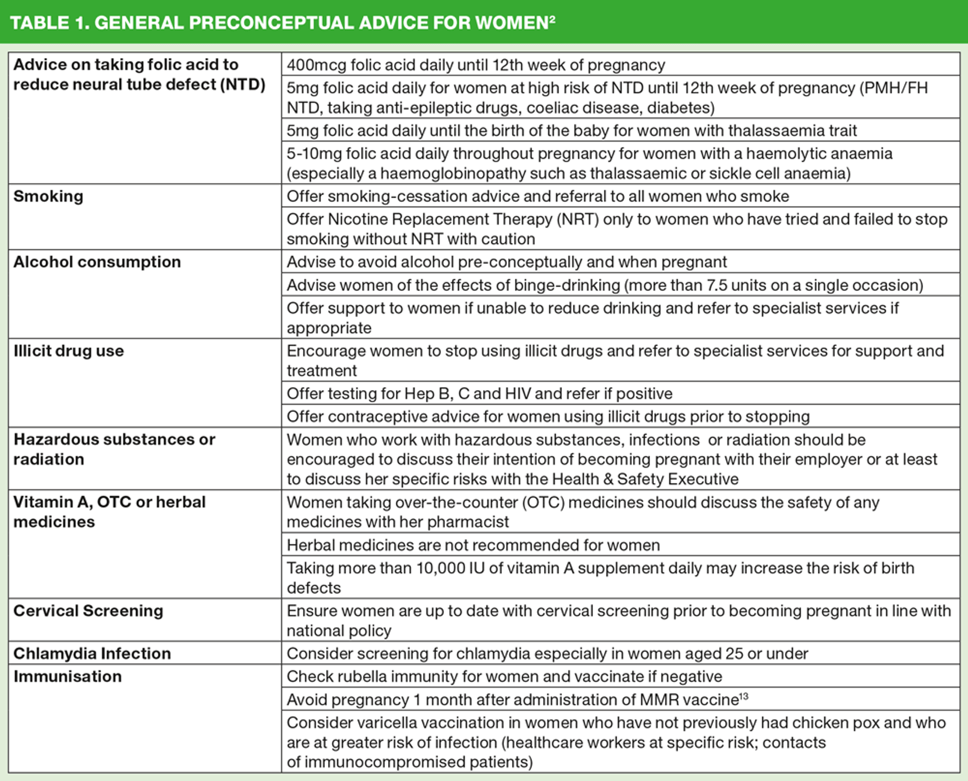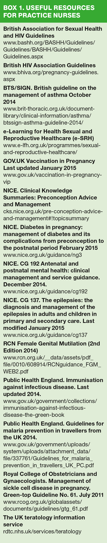 2. National Institute for Health and Care Excellent. Clinical Knowledge Summaries. Pre-conception Advice and Management. June 2012. cks.nice.org.uk/pre-conception-advice-and-management