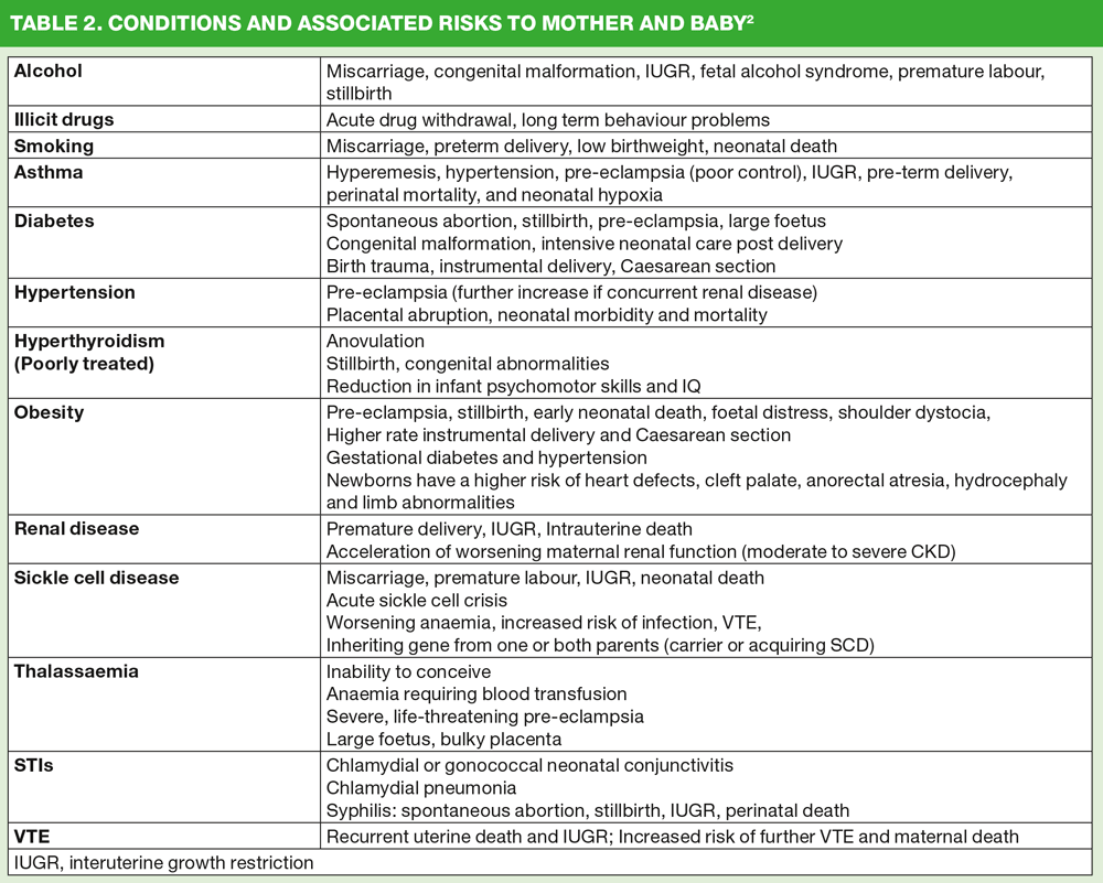 Women who have longer-term illnesses and chronic disease may be at greater risk of problems in pregnancy and additionally the health of the developing infant may be significantly compromised (Table 2). Specialist intervention is necessary to manage many of these higher-risk women in the preconceptual phase to ensure optimum health and safe medicine management. The list is not exhaustive, but the following have specific implications pre-conceptually of which practice nurses need to be aware.