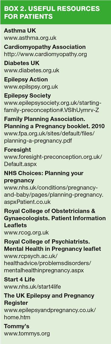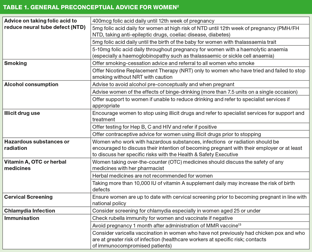 In general practice women often actively seek our advice to discuss how best to prepare themselves for pregnancy. Consultations for women’s health issues, sexual and reproductive health and cervical screening, for example, naturally lend themselves to discussing preconceptual care. However, we need to be equally aware of the specific issues and considerations for women of childbearing age who have additional health issues. Preconceptual care is also about managing long-term conditions specifically with pregnancy in mind to ensure the best possible outcome for maternal and child health. Women who have increased risk of inherited genetic disorder are not covered in this article although referral for genetic screening and counselling would be appropriate.