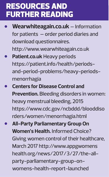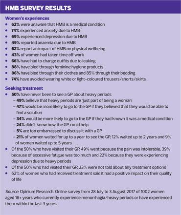 HMB is a distressing condition that can have a significant physical, psychological and social impact on affected women. HMB is a common reason for consultation in general practice, but even so, many more women fail to report it to a healthcare professional, either because they are embarrassed or are unaware that treatment is available. General practice nurses can play a key role in opening channels of communication: they have ample opportunities (during contraception and sexual health consultations, cervical screening, well woman clinics etc) to start the discussion, and if appropriate, communicate the range of treatment options available.