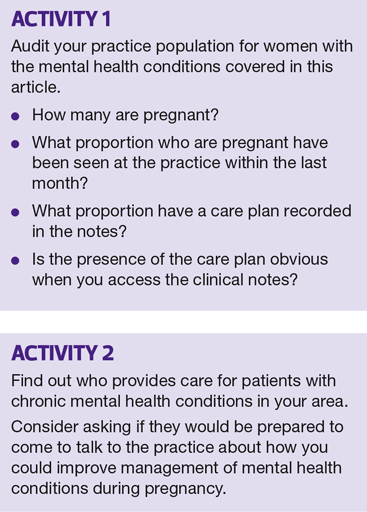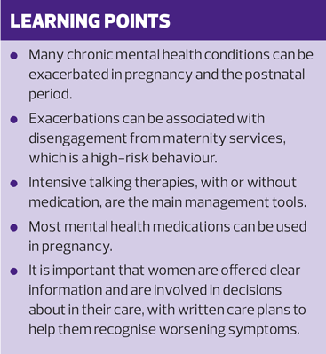 Women with mental health conditions may need intensive input in pregnancy. It is important to involve them in their care, using written care-plans, and to have regular review and clear communication between teams. Failure to attend appointments should be followed up.
