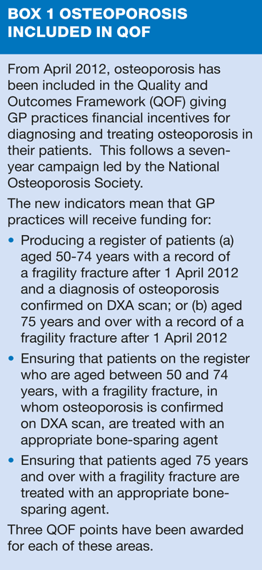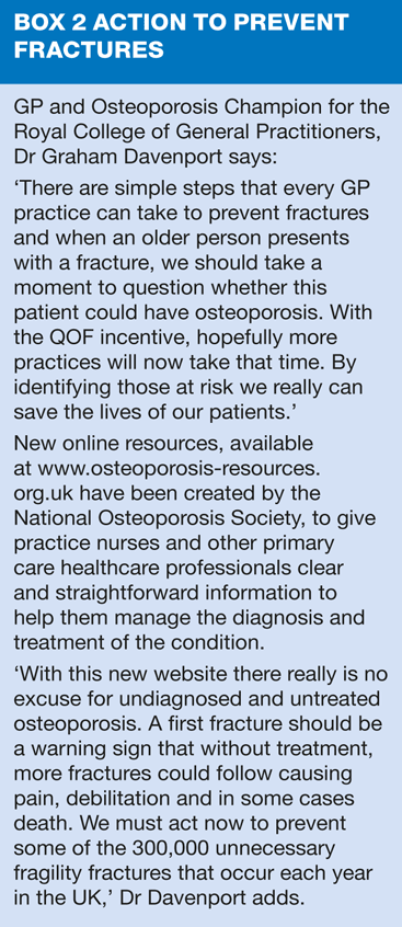 Secondary prevention of osteoporotic fractures has been included in the Quality and Outcomes Framework (QOF) since April 2012, but there is additional scope for practice nurses to consider incorporating osteoporosis risk assessment into other areas of chronic disease management.