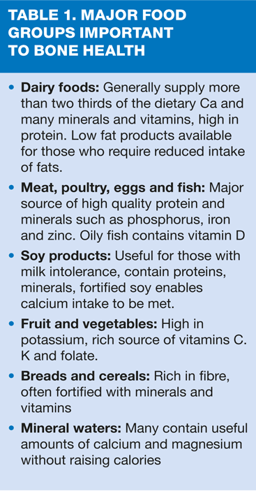As part of her diabetes management Mrs D should have been given relevant dietary advice but it would be worth checking that she is eating a well balanced diet that will also optimise bone health. She needs at least 700mgs of calcium daily and a variety of foodstuffs to provide protein, vitamins and minerals to maintain skeletal integrity (Table 1).