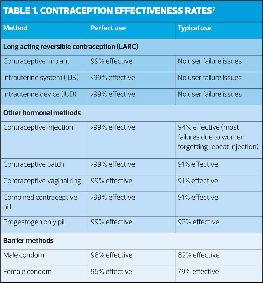 No method of contraception is 100% effective, however as LARC methods require no daily action, their efficacy remains high. Effectiveness rates, according to the NHS,7 are shown in Table 1.