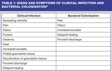 Bacterial colonisation, as described above, can be destructive in a wound. However, colonisation is often misdiagnosed and this can lead to inappropriate and sometimes dangerous use of antibiotics leading to Clostridium difficile or methicillin-resistant Staphylococcus aureus (MRSA). Colonisation should be simple for the nurse to assess and deal with through use of antibacterial dressings, whereas clinical infection should nearly always be dealt with using systemic antibiotics. There is no place for topical antibiotic therapy in this situation. The signs and symptoms that can help differentiate between clinical infection and bacterial colonisation are listed in Table 1.