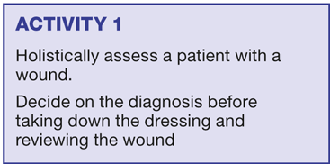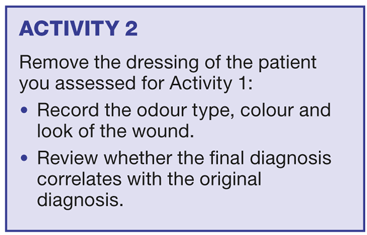 Haemolytic streptococcus may sometimes be identified because there are clots of blood in the dressing on removal. This particular bacterium can destroy a wound very quickly. If any wound is enlarging and has clots of blood, a swab should be taken and antibiotics requested. However, swabbing a wound is no longer common practice as it is unnecessary if the above rules of assessment are applied.9 A swab will only direct the prescriber to what is sitting on the surface of the wound and not to what could potentially be present in the host tissues beneath the wound.