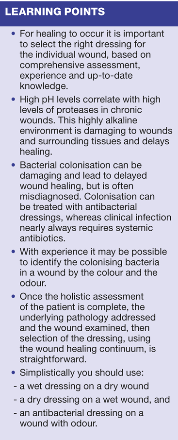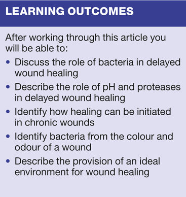 Much is written about the ideal wound healing environment,2-4.and it is usually directed at the type of dressing that should be used. This is not necessarily useful as the type of dressing required relies on how the underlying pathology is addressed. For example, if the wound is a pressure ulcer, then even the most appropriate dressing will never heal the wound if the pressure is not relieved; if it is a venous leg ulcer, then the wound will not heal if compression is not properly applied. Likewise, an arterial wound requires the input of a vascular surgeon to ensure the internal problem is rectified so that the dressing can then provide the correct environment to encourage the wound to heal. If a wound is colonised with bacteria there is a potential for wound healing to be delayed, due to raised chronic proteolytic enzymes and a raised pH, unless the bacteria are reduced. Any or all of these problems need to be addressed first so that the wound can then progress toward healing.
