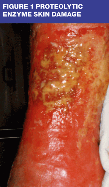 In the acute phase, protease levels rise in response to wounding and, when present in appropriate concentrations, they promote cell migration and activate growth factors. Protease levels then decrease as the wound heals. In chronic wounds, however, protease levels rise and remain elevated and the pH is raised to an alkaline level. This becomes damaging to wounds and the surrounding tissues. (Figure 1) If a pH value is taken in the wound in figure 1, it will be found to be high, possibly as high as 8.4. To promote healing of this wound it is important to lower the wound pH, and subsequently the level of damaging proteolytic enzymes. This can easily be accomplished through use of dressings such as honey, iodine cadexomers and silver dressings. All of these dressings will lower the pH and reduce bacterial colonisation.