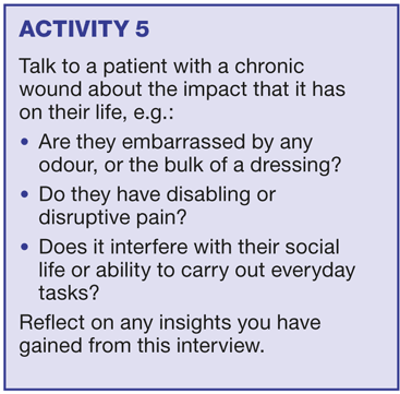 The actual problem experienced by patients is often not the wound itself, but the manifestation of the wound symptoms. Pain, exudate loss and odour can be all prevailing and can ruin quality of life for any patient at any age. Wound healing is about treatment of the patient and their wound and not about managing the symptoms. Placing Gamgee pads to mop up fluid or carbon to reduce odour is management of symptoms and not dealing with the cause. Once the cause is identified, the pathology addressed and an appropriate dressing selected then it is less likely that the wound will overtake the patient's social life and they will be better able to deal with it.
